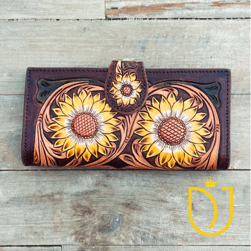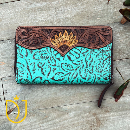 Turquoise Painted Sunflower Hand Tooled Leather Wallet