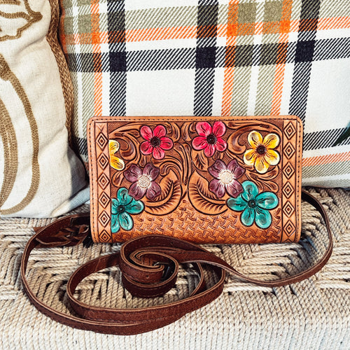 Crimson and Cream Hand Tooled Leather Crossbody Wallet