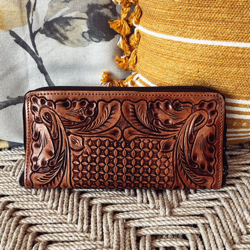 Dive into the details of our Western leather wallets and clutches, where every stitch tells a story of genuine artistry. Dodi Jo's understands that functionality is key, which is why our American Darling collection features thoughtful designs with ample card slots, secure compartments, and convenient sizing. Whether you prefer a compact bifold to slip into your pocket, a spacious trifold to hold all your necessities, or a chic clutch for a night out, you’ll find a design that perfectly suits your needs. The natural variations and rich textures of the genuine leather used in these wallets and clutches only enhance their appeal, developing a unique patina over time that tells of your adventures. These aren't just accessories; they are companions for your daily journey, built to withstand the rigors of an active lifestyle while maintaining their inherent beauty. Discover the perfect companion for your style on our product pages, or browse our entire collection of leather wallets.