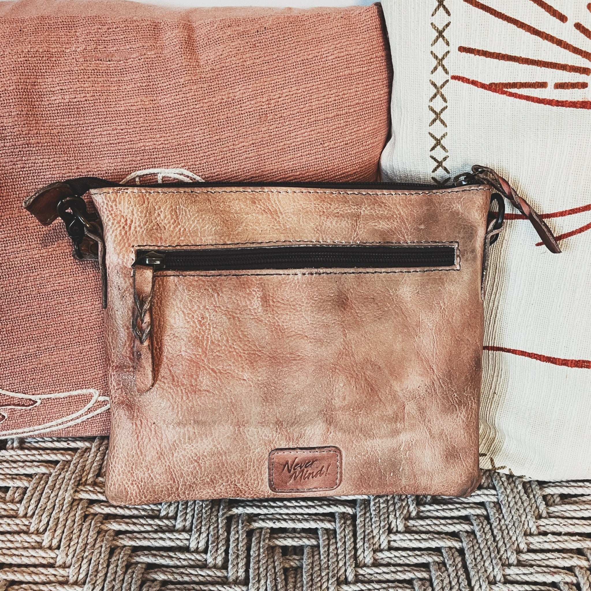 The Never mind creations are hand dyed and finished using individual dyeing method (every creation is individually passed through numerous stages of proprietary method of hand dyeing, brushing, and finishing). It is high time consuming and a detail demanding process. However, the result is a beautiful vintage look with every creation having its own unique and exclusive look.
