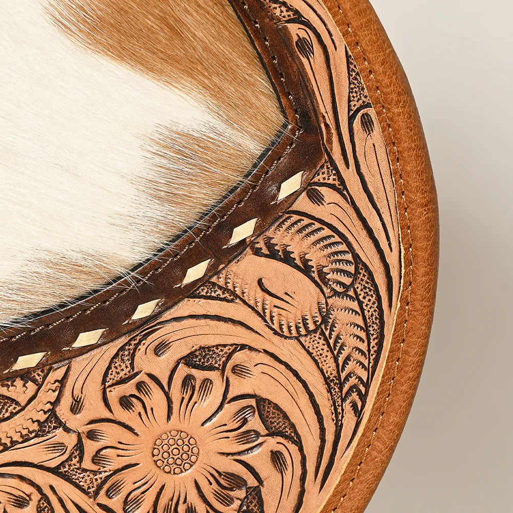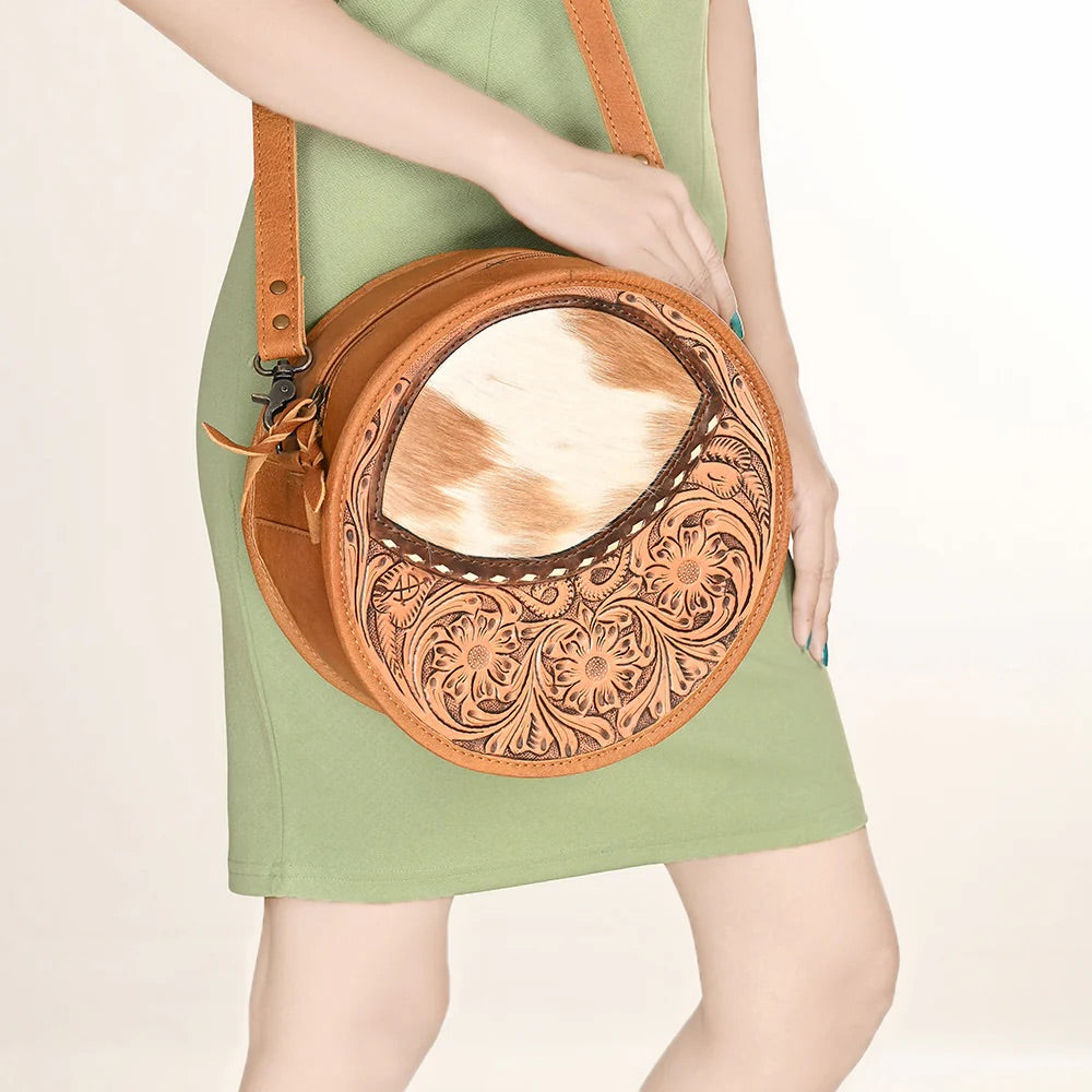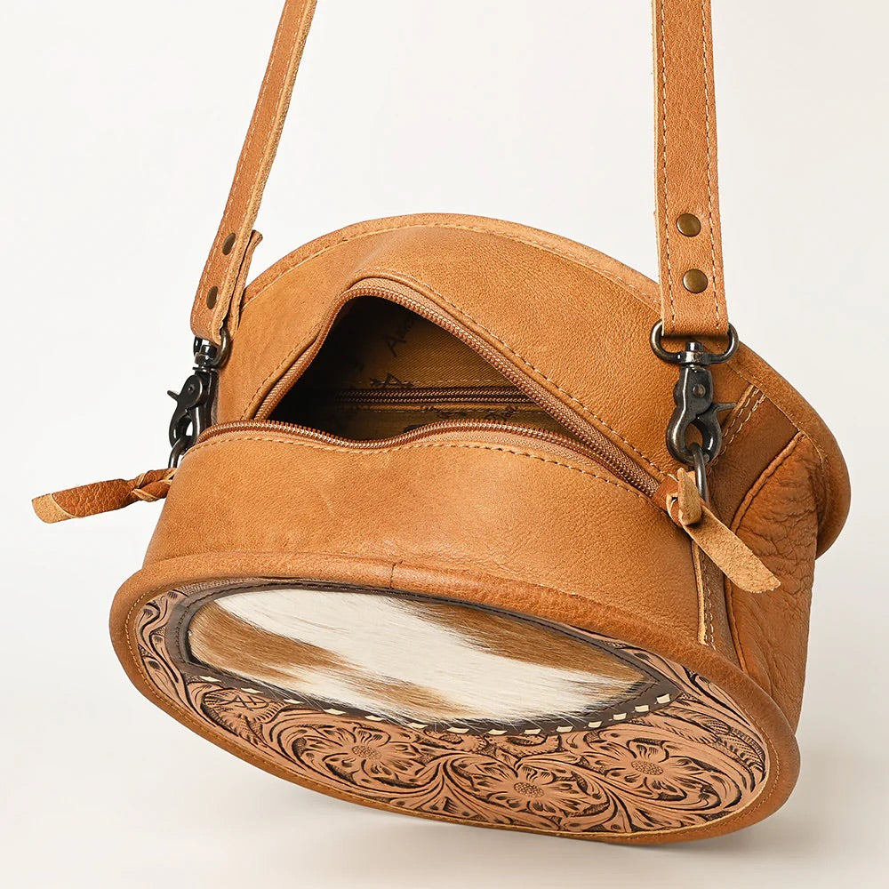 American Darling Hand Tooled Leather and Hair On Cowhide Canteen Crossbody Purse