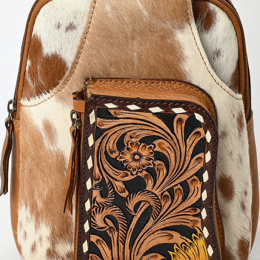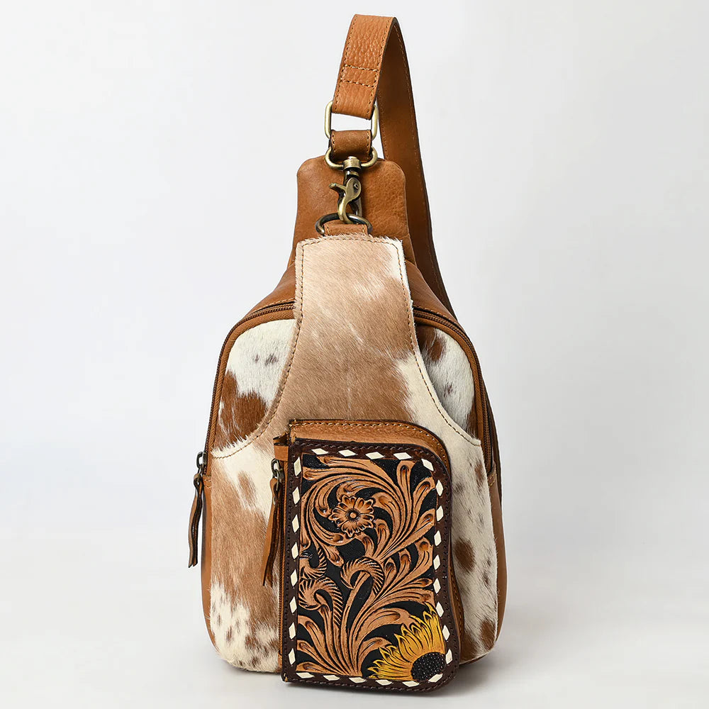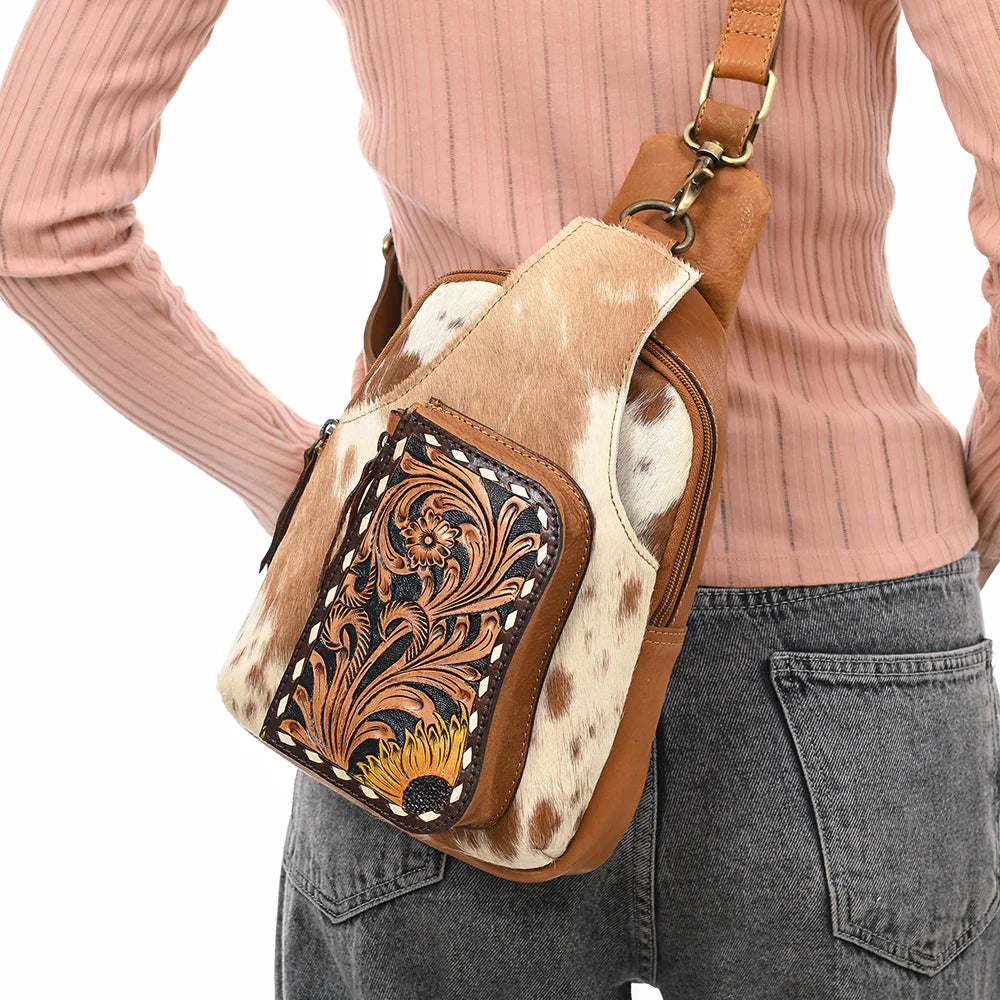 American Darling Genuine Hand Tooled Leather and Hair On Cowhide Sling Bag