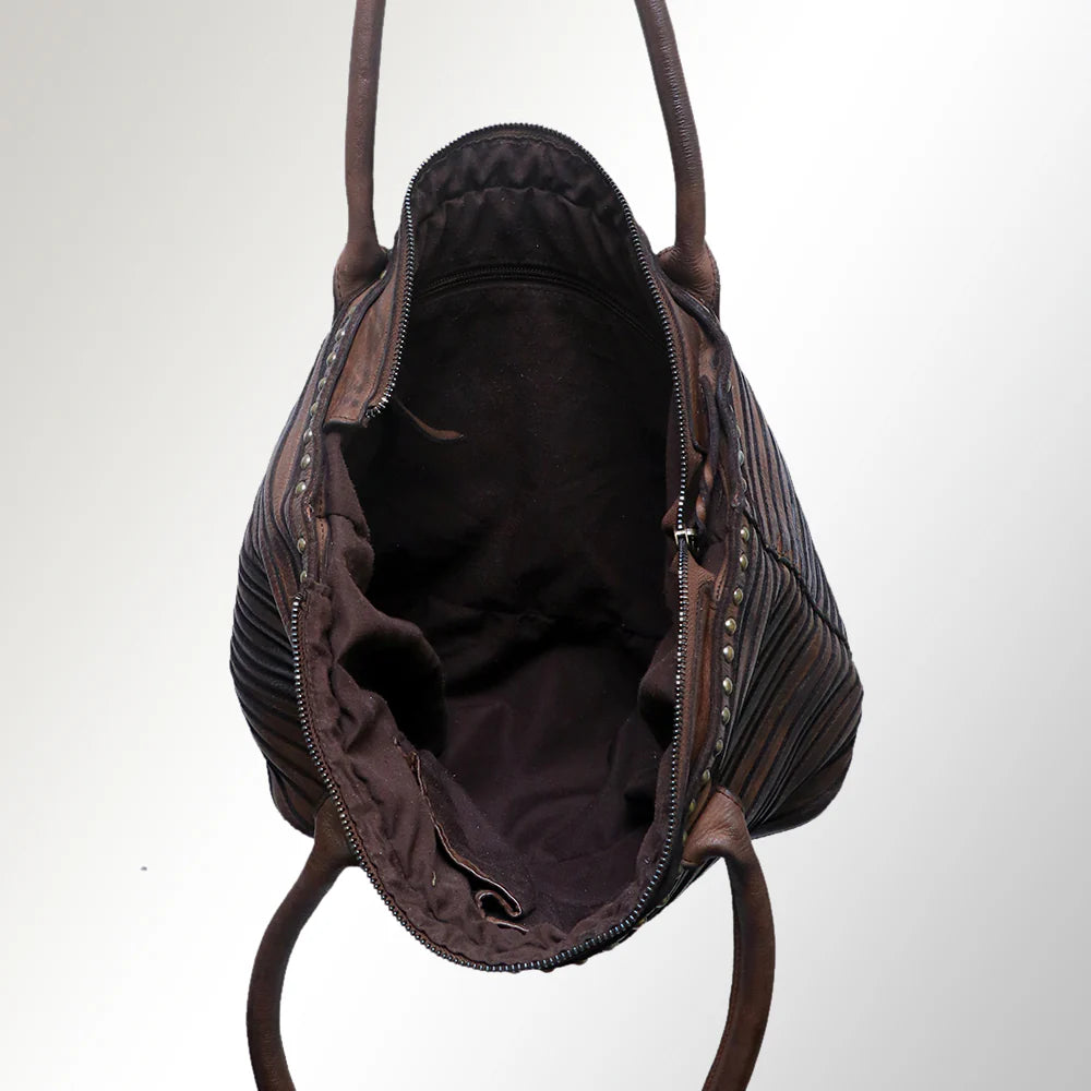 The Never mind creations are hand dyed and finished using individual dyeing method (every creation is individually passed through numerous stages of proprietary method of hand dyeing, brushing, and finishing). It is high time consuming and a detail demanding process. However, the result is a beautiful vintage look with every creation having its own unique and exclusive look.