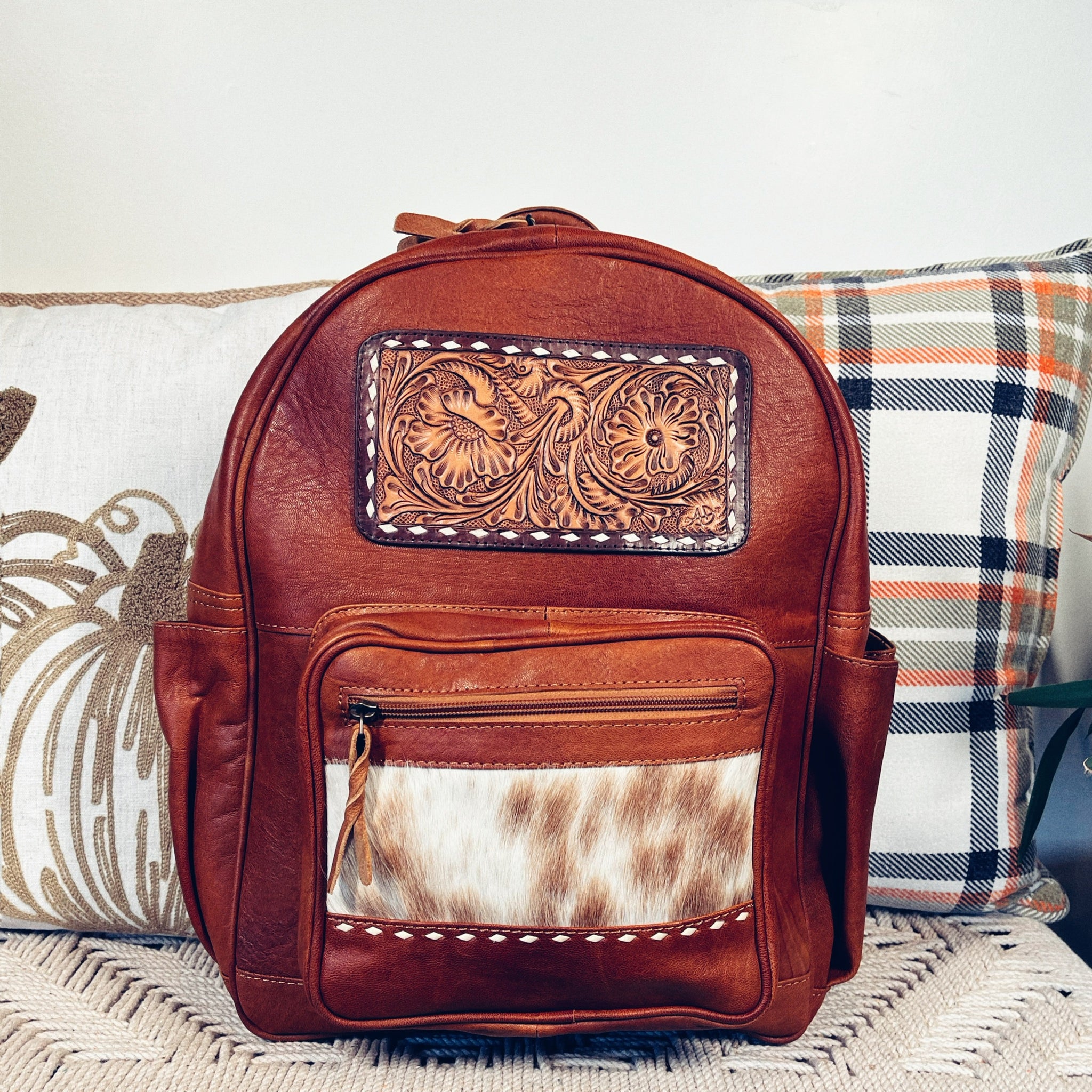 Genuine Hair-on Cowhide leather is used at the front of this backpack. There’s a pocket of hand woven wool saddle blanket suitable for easy access to your important stuff. The pocket is closed with a flap closure and is decorated with mesmerizing floral carving on meticulous hand-tooled vegetable tanned Cowhide genuine Leather.