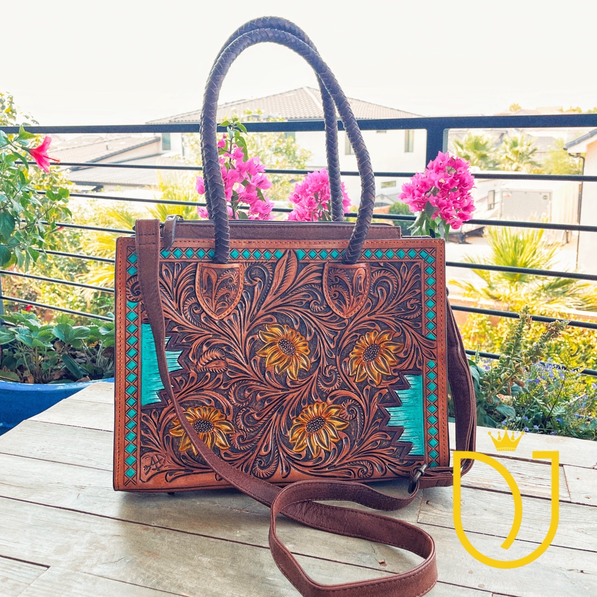 This stunning hand tooled leather bag is sure to complete any look and turn all the heads!