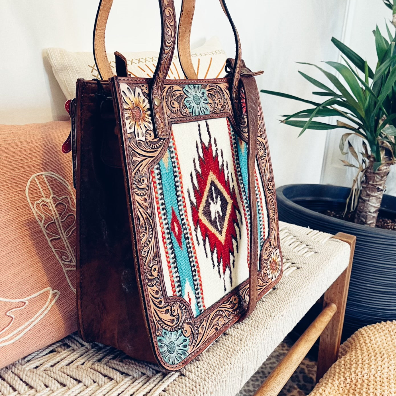 American Darling Western Hand Tooled Leather and Saddle Blanket Shoulder Bag or Crossbody Purse